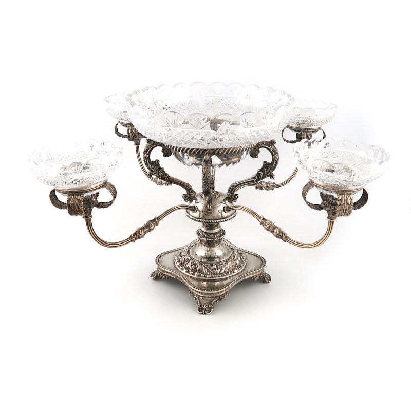 baluster column with foliate decoration, with four leaf capped foliate supports holding a central gadroon ring, with a central glass bowl, with four fluted scroll arms each supporting a further glass bowl, on a shaped square base on four shell bracket feet, the base weighted, height 32cm, approx. weight of arms 25oz.