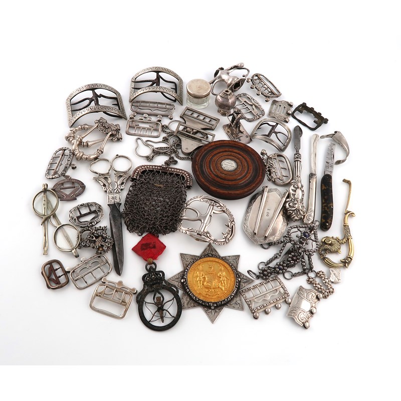comprising silver items: a Victorian Ancient Order of Foresters jewel of Office, by Ezekiel Loewenstark, London 1845, various buckles, a silver mounted small dressing table pot, a pair of swing handles, a miniature figural group with import marks for London 1889, an unmarked mesh purse, and other items, plus metalware items including a pair of buckles and a folding fruit knife with tortoiseshell handle, approx. weighable 11.8oz. (qty)