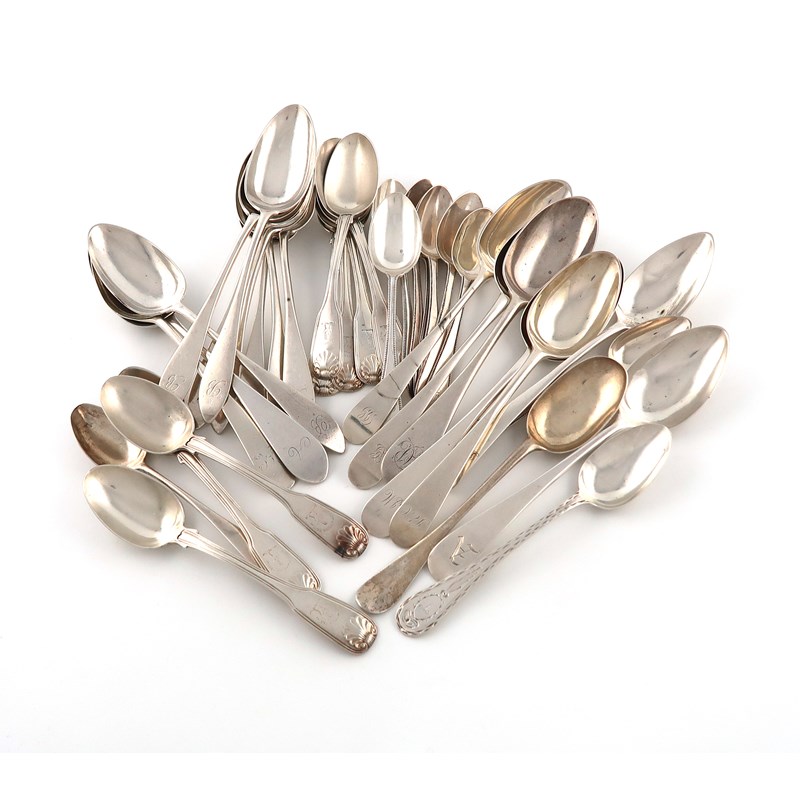 comprising: a set of eight George III Celtic-point pattern teaspoons, by J. McKay, Edinburgh 1789, the terminal with an initial 'B', plus a set of six Glasgow Fiddle, Thread and Shell pattern teaspoons, ten further dessert spoons, and ten teaspoons, approx. weight 30oz. (qty)