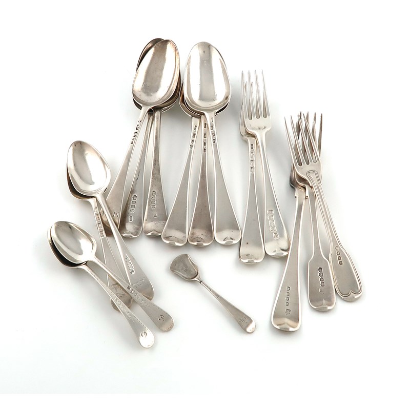 comprising: a set of three tablespoons, London 1778/79, the reverse of the terminals crested, three further tablespoons, three table forks, two dessert forks, two dessert spoons, two teaspoons and a salt spoon, approx. weight 26oz. (16)