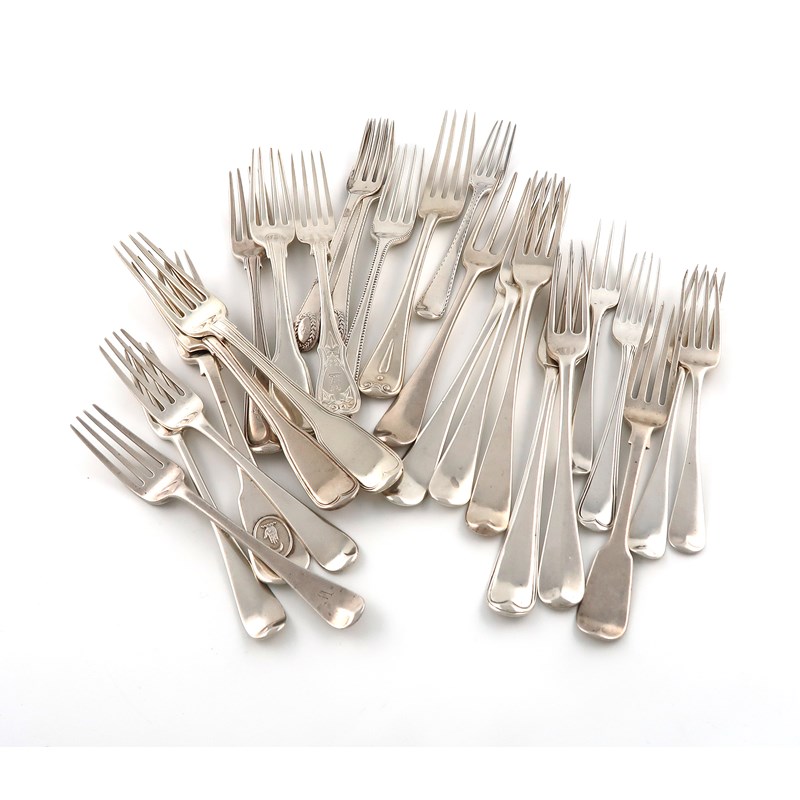 including thirteen table forks, and twelve dessert forks, one with a private die terminal of a hand below a crescent, approx. weight 48oz. (25)