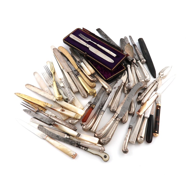 various patterns, with silver mother-of-pearl, tortoiseshell and silver brass handles, including a silver-gilt pistol grip dessert knife and fork, various French examples, and a cased Victorian fork and spoon set. (qty)
