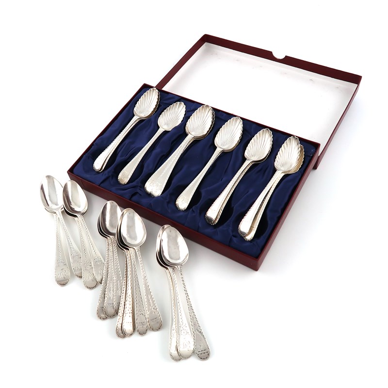 Pleased note: The 1783 spoons are a matched set, seven are by J. Lambe, one is by Hester Bateman.