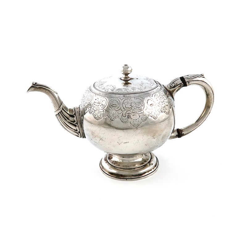 bullet form, leaf capped scroll handle with insulators, one is wooden and one is horn, chased foliate decoration, flush-hinged cover with a ball finial, on a raised circular foot, later initial, length handle to spout 15.5cm, approx. weight 20.8oz.