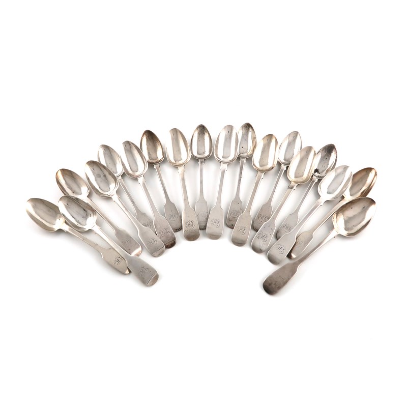 A matched set of eighteen Victorian Irish silver Fiddle pattern teaspoons