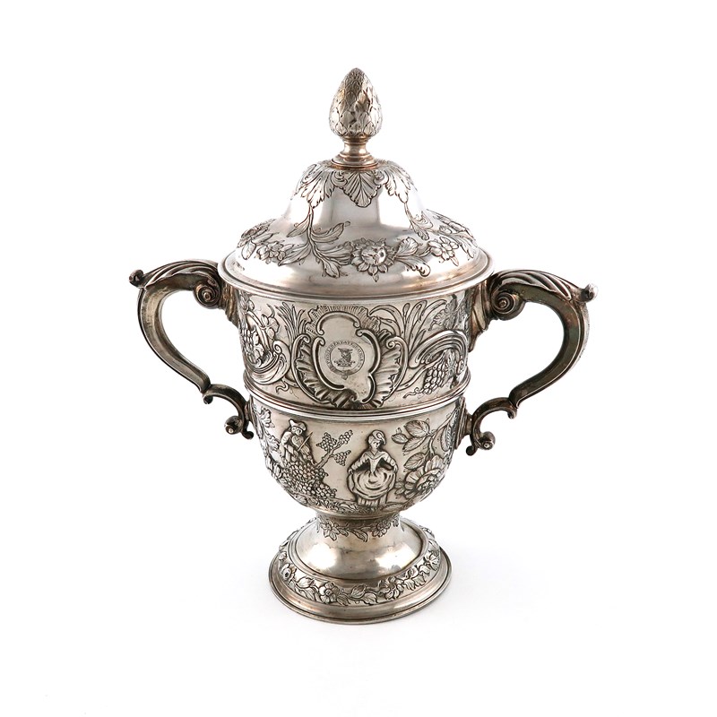 circular form, central girdle, embossed with figural scenes in landscape settings, trailing vines, scroll-work and foliate decoration, engraved with an armorial and later crest, the pull-off cover with a cone finial, on a raised circular base, height 35cm, approx. weight 63oz.