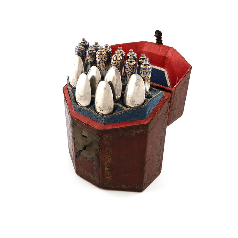 the knives and forks with blue and white decoration with gilded highlights, the steel blades stamped 'HASIS' the forks with two prongs, the spoons with a scroll terminal, two of the forks have replacement handles, length of spoon, 19.2cm, in a fitted leather travelling case with a brass handle and a lock and key, approx. weighable 9oz.