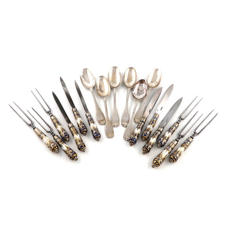 A set of six 18th century silver spoons, with six porcelain handled knives and forks,