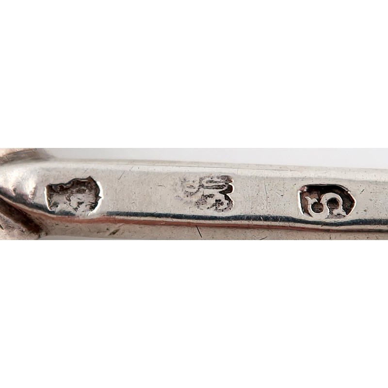 fig-shaped bowl, tapering faceted stem, the finials with traces of gilding and with a holy dove nimbus, the reverse of the bowls with scratch initials 'O' over 'IT', lengths 18.1cm and 17.8cm, approx. weight 3.6oz. (2)