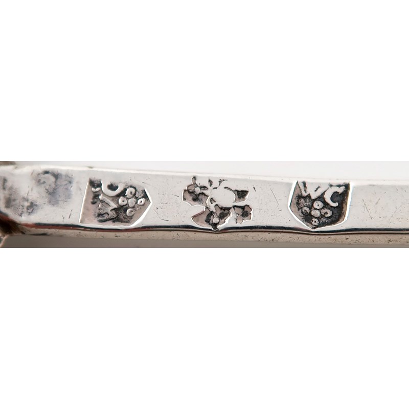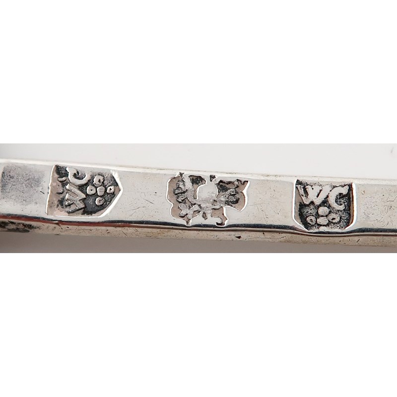 fig-shaped bowls, faceted tapering stems, gilded initials, each nimbus prick-dot initialled 'R*B' '1663' over 'I*M', and 'S*B' over '1663' over 'I*M', length 17.8cm, approx. weight 2.8oz. (2)