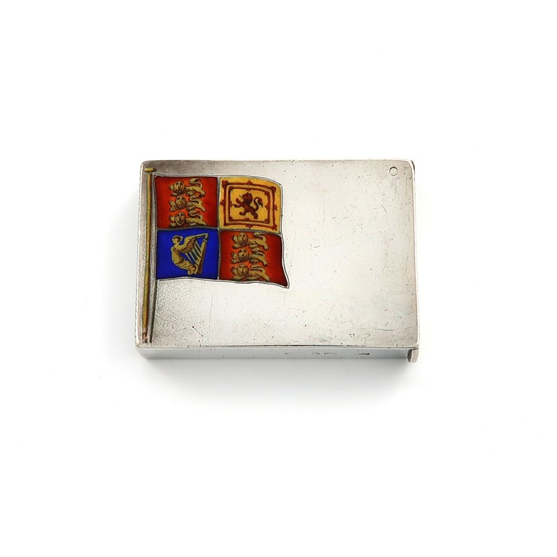 rectangular form, enamelled with the Royal Standard on a flagpole, hinged cover, the reverse inscribed, length 4.5cm, approx. weight 1oz.