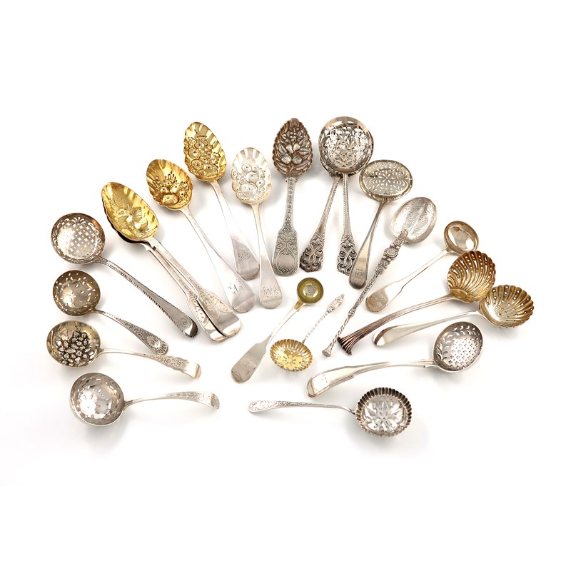 comprising: a pair of pierced fruit serving spoons, by Ackroyd Rhodes, London 1914, plus six tablespoons, the bowls with later berry decoration, a cream ladle, a condiment ladle, an anointing spoon, plus ten various sugar sifting ladles, approx. weight 31oz. (qty)
