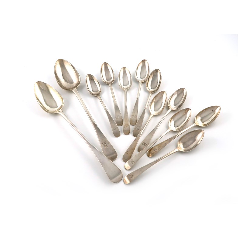comprising: a basting spoon, by Crossley and Smith, London 1811, a basting spoon, by William Easterbrook, London 1825, and a set of ten George III Scottish dessert spoons, maker's mark of AC, Edinburgh 1797, approx. total weight 18oz. (12)