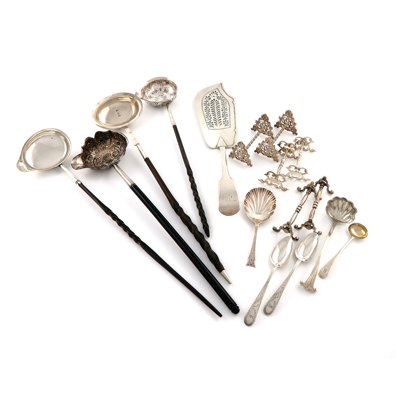 comprising: a William IV Fiddle pattern fish slice, by William Eaton, London 1832, pierced blade, the terminal with initial, plus a pair of provincial knife rests, by Josiah Williams & Co, (of Bristol), Exeter 1867, two other pairs of knife rests, a single knife rest, a George III Onslow pattern cream ladle, four spoons and four Georgian silver punch ladles, approx. weight 14oz. (qty)