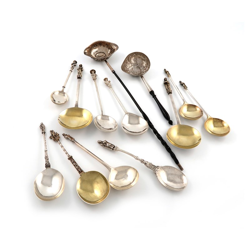 comprising; a late-Victorian Apostle spoon, by George Lambert, London 1892, a pair by Martin Hall and Co., Sheffield 1882, another pair, plus six others with Apostle/figural finials, plus two George III punch ladles,