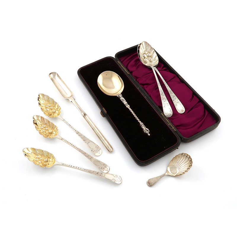 comprising: a George III provincial Fiddle pattern marrow scoop, by Simon Levy, Exeter 1819, length 23.7cm, plus two tablespoons and three dessert spoons with later berry decoration, a caddy spoon and a cased silver Apostle spoon, London 1874, approx. weight 9.7oz. (qty)