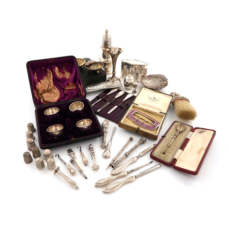 comprising: an Edwardian tea caddy, of shaped oval form, by William Hutton and Sons, Birmingham 1904, shaped oval form, a late-Victorian caster, a spectacle case, a vase, a cased anointing spoon, six cased teaspoons, a butter shell, four salt cellars in a later case, and eight thimbles, a silver-gilt and enamel buckle, Birmingham 1911, a pepper, two salt cellars, three desk seals, three pencils, a brush, various manicure items, approx. weighable 17oz. (qty)