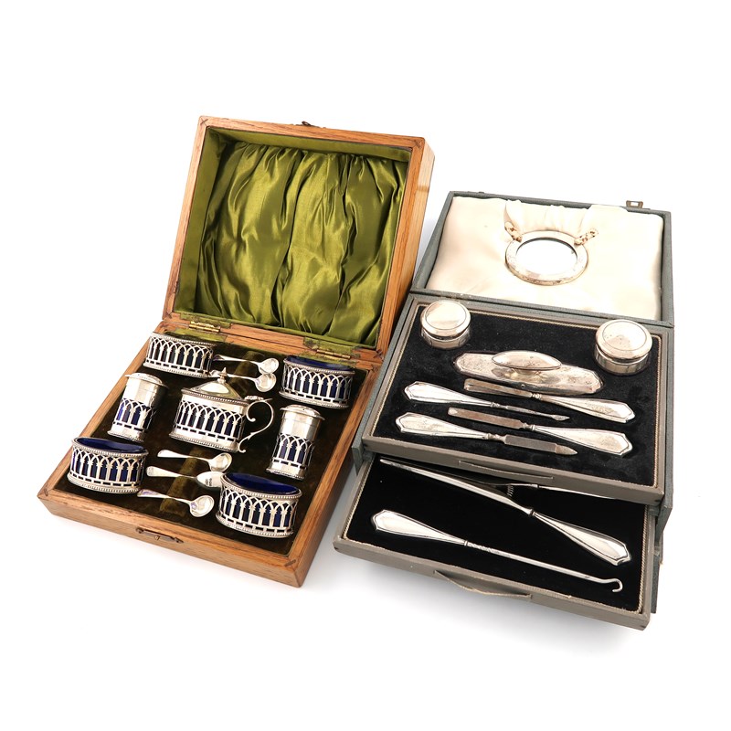 oval form, pierced Gothic arch decoration, with blue glass liners and with five condiment spoons, in a fitted wooden case, plus a cased silver manicure set, comprising a circular mirror, two toilet jars, a buffer, four nail implements, a shoe horn, a button hook and a pair of glove stretchers, approx. weighable 7.5oz. (2)