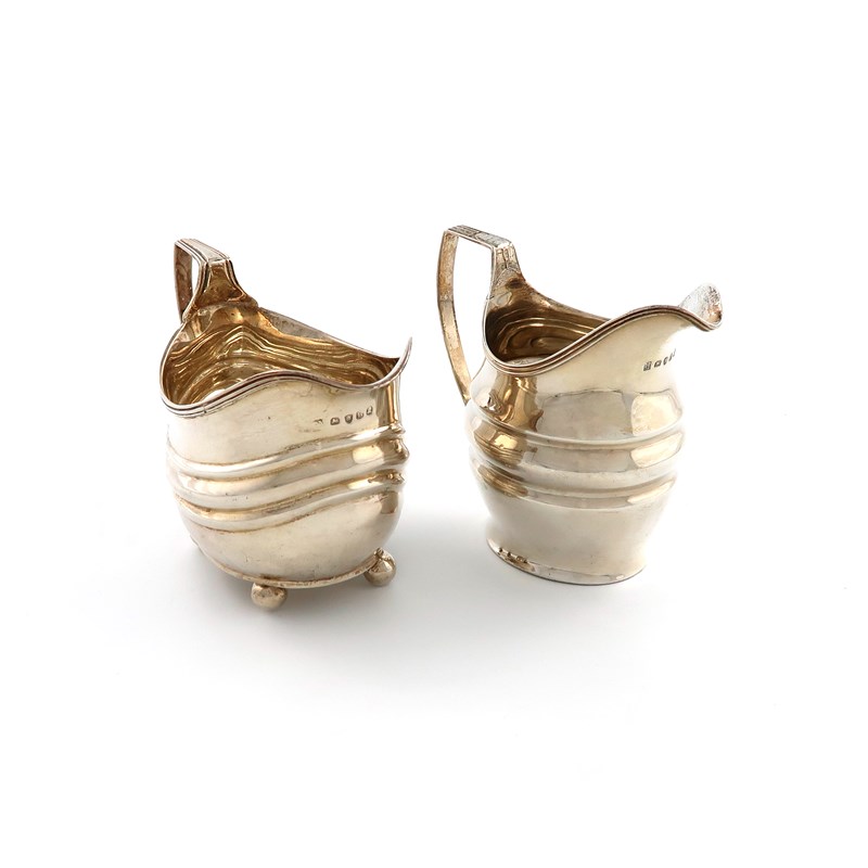 oval form, reeded scroll handle, height 9.8cm, plus another George III silver cream jug, by Elizabeth Morley, London 1812, oval bellied form, scroll handle, on four ball feet, height 9.4cm, approx. total weight 7.5oz. (2)