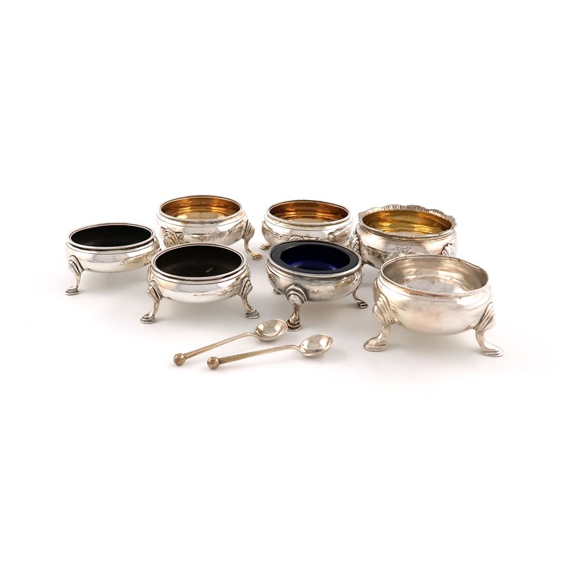 of cauldron form, on three hoof feet, comprising; a pair by Robert Hennell, London 1774, beaded borders, another pair, London 1787, and three singles, one with a blue glass liner, plus two later salt spoons, approx. weight 13oz. (9)