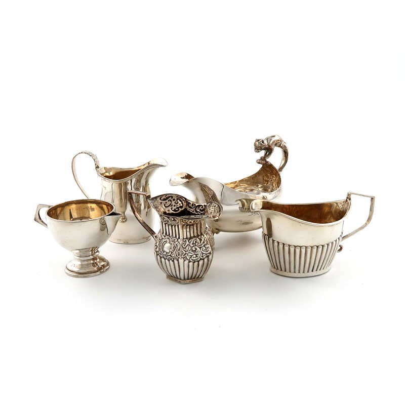 comprising: a George II silver cream boat, maker's mark worn, London 1758, oval form, the scroll handle with a feline animal, on three claw and ball feet, length 13.8cm, plus four various cream jugs, approx. weight 11oz. (5)