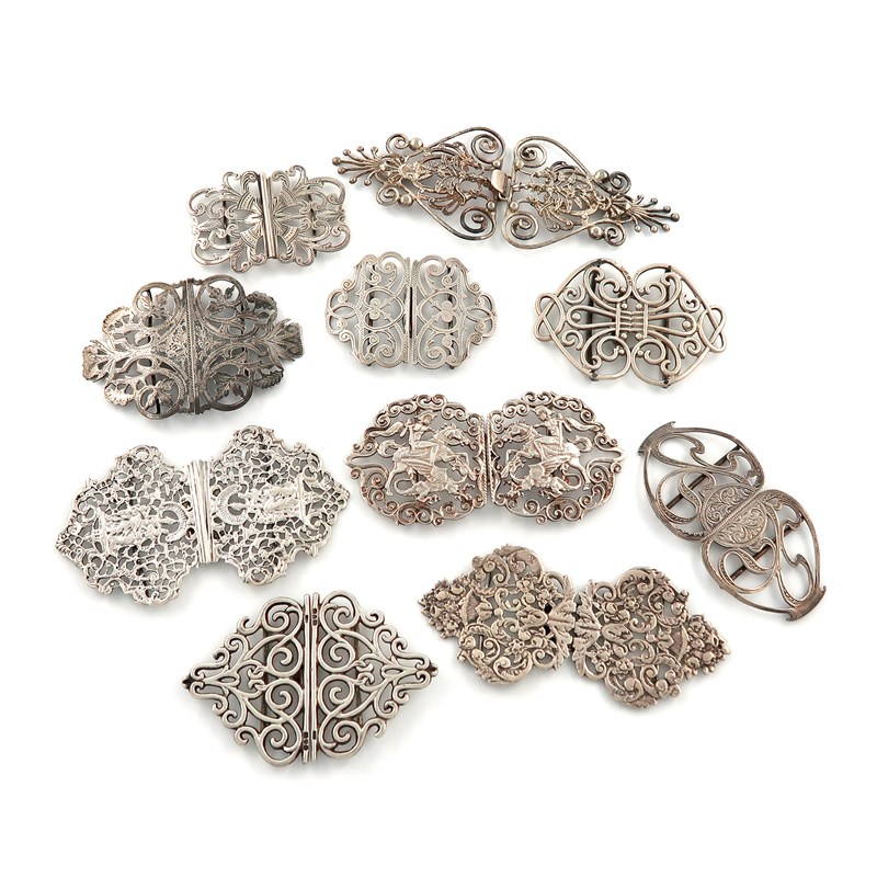 including: a Victorian one by Thomas Johnson, London 1879, pierced and chased with foliate and scroll decoration, a late-Victorian one with Art Nouveau decoration, by Deakin and Francis, Birmingham 1900, and eight other examples, approx. weight 12.4oz. (10)