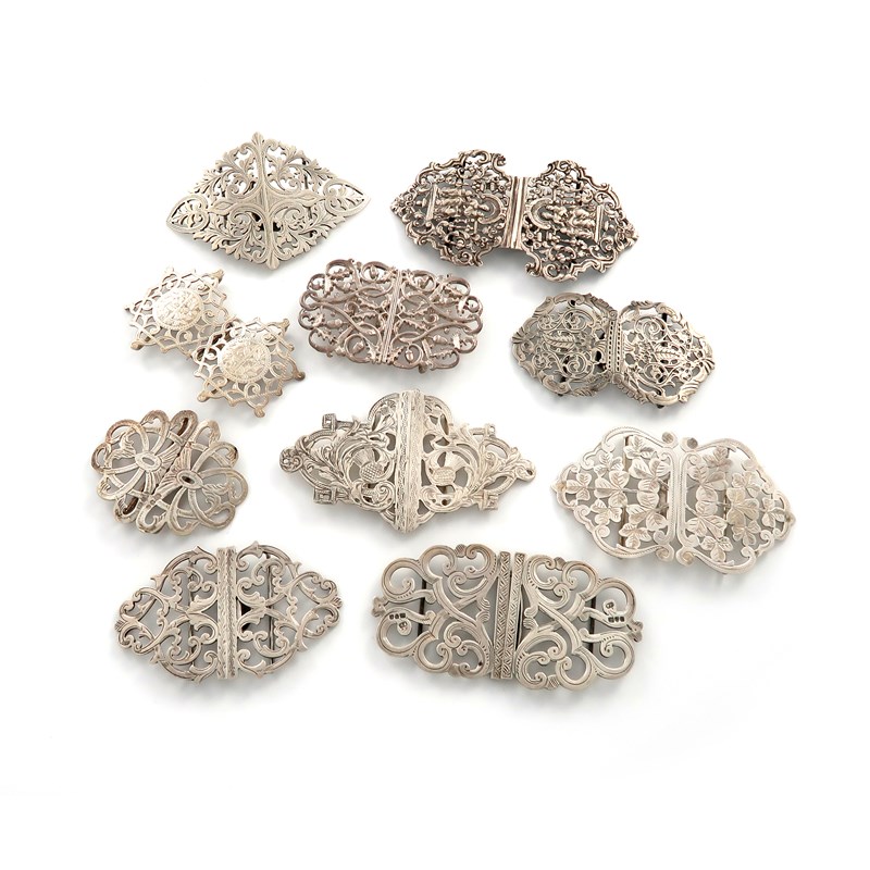A collection of ten silver nurse's buckles