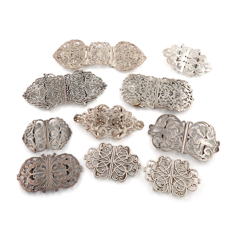 A collection of ten silver nurse's buckles