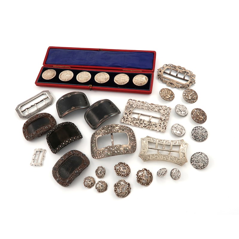 comprising: a cased set of six buttons, with import marks for London 1902, and Sheffield 1901, decorated with milk maids and farming ladies, plus fifteen various buttons, a Dutch buckle, five further buckles, plus five cut steel buckles, approx. weighable 7.5oz. (qty)