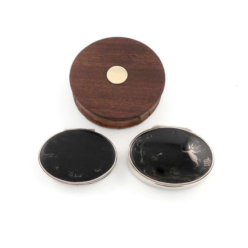 oval form, the hinged cover with a tortoiseshell panel, inlaid with Eros firing an arrow, the underside with a tortoiseshell base, plus an 18th century silver and tortoiseshell snuff box, of oval form, and a silver-gilt mounted wooden snuff box, replacement cover, by Nathaniel Mills, Birmingham 1834, length 8cm. (3)