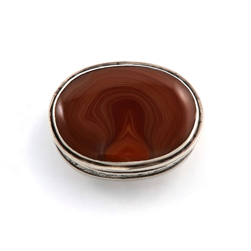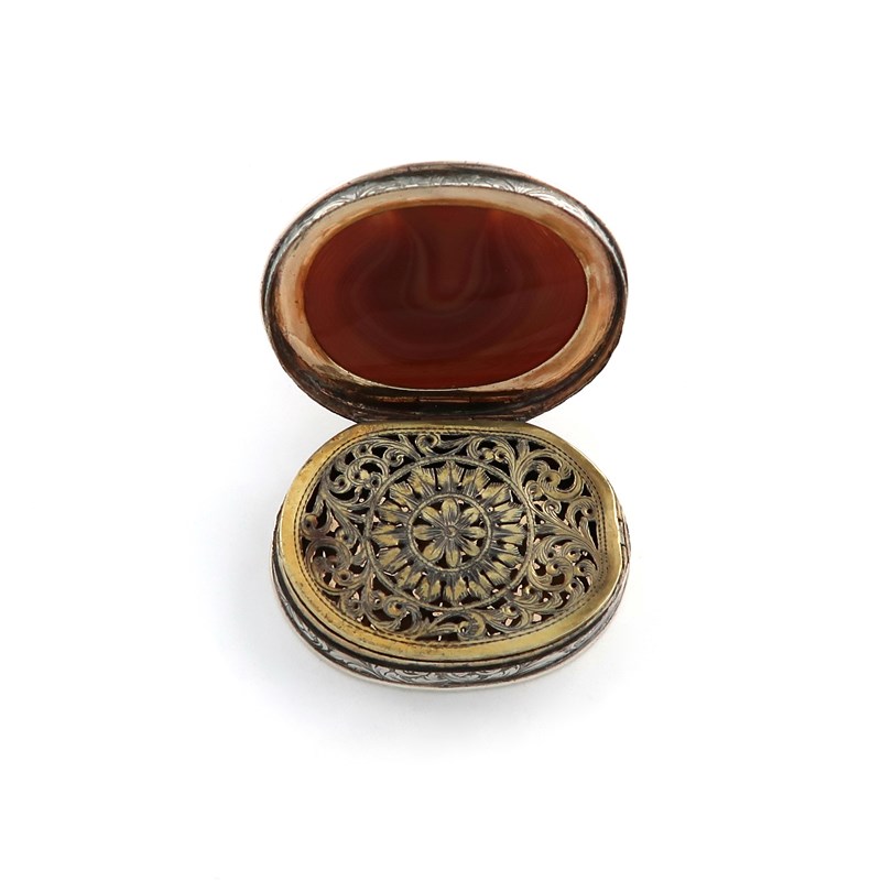oval form, engraved sides and base, the underside with a vacant cartouche, the hinged cover with an agate panel, the interior with a pierced and engraved foliate scroll grille, length 5.2cm.