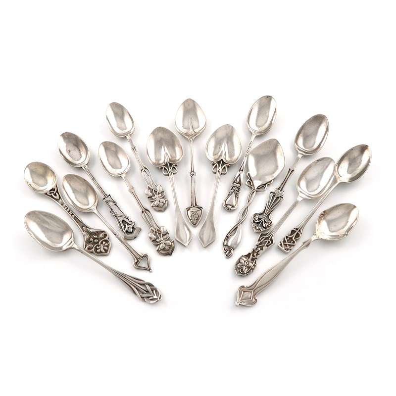 stylised finial, some with pierced decoration, including one in the Alexander Ritchie manner, titled 'IONA', approx. weight 7oz. (15)