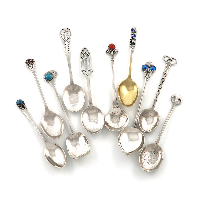 A collection of ten Arts and Crafts and Art Nouveau silver teaspoons
