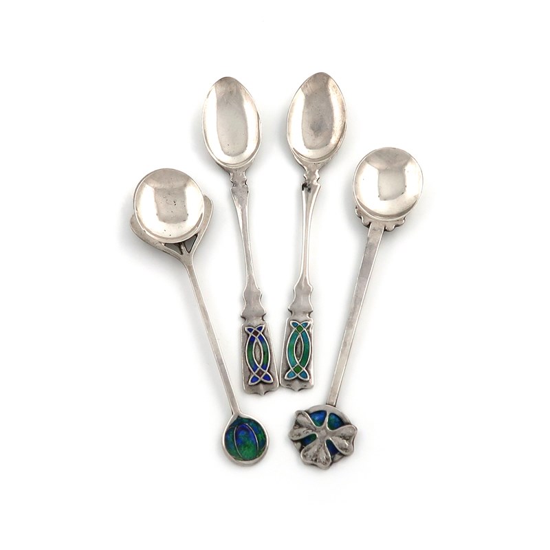 By W. H. Haseler, four Edwardian Art Nouveau silver and enamel teaspoons,