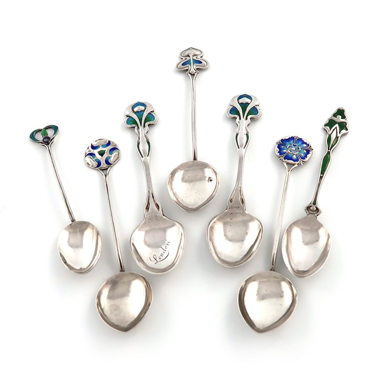 A collection of seven Edwardian Art Nouveau silver and enamel teaspoons,