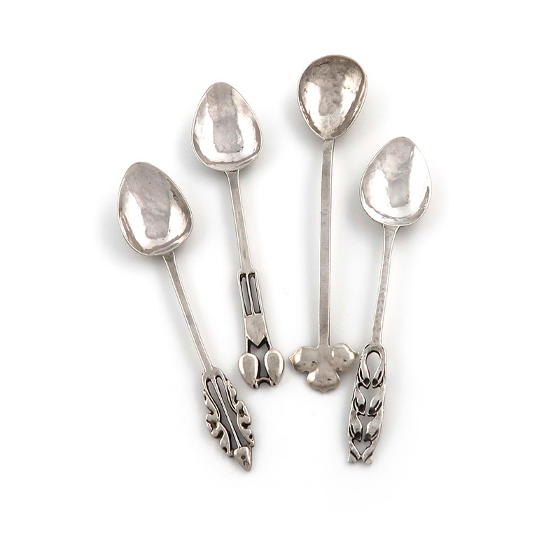 By A. E. Jones, four Arts and Crafts and Art Nouveau silver teaspoons,