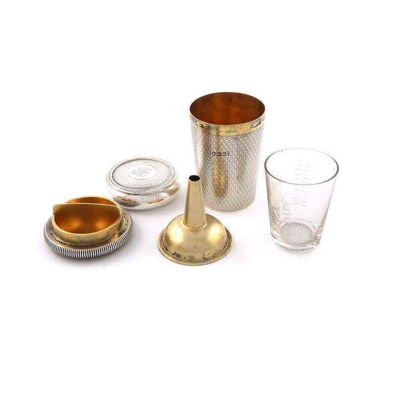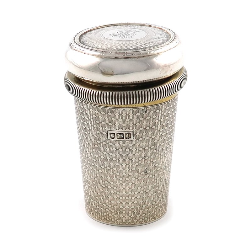 comprising a beaker and cover with engine-turned decoration, a bayonet fitting compartment with two sections, a funnel and a glass measure, with traces of gilding, height 7.3cm, approx. weight 4oz.