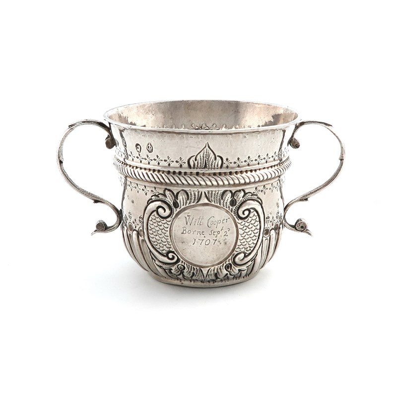circular form, part-fluted decoration below a rope-work border, scroll handles, the cartouche pricked 'Witt Cooper Borne Sept. 2 1707', height 8.5cm, approx. weight 5.8oz.