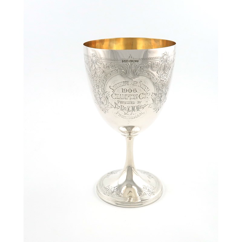 urn shaped bowl, engraved decoration, the interior gilded, inscribed, on a raised circular foot and stem, height 24.8cm, approx. weight 17.5oz.