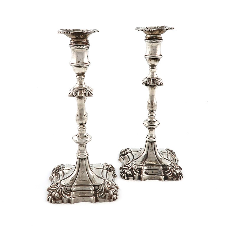 knopped baluster stems, shell shoulders, spool-shaped capitals, rope-work borders, on raised shaped square bases, the underside of the base engraved 'No.1' and 'No.4', with detachable drip pans, engraved 'No.1' and 'No. 4', height 24.5cm, approx. weight 36.9oz. (2)