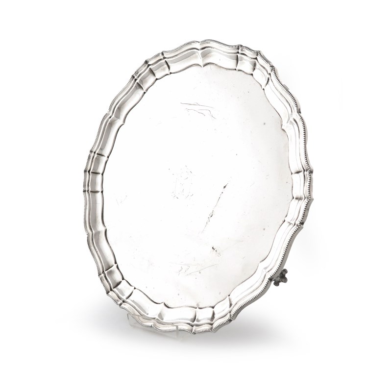 circular form, beaded border, on three claw and ball feet, the centre with a monogram, diameter 29.5cm, approx. weight 28oz.