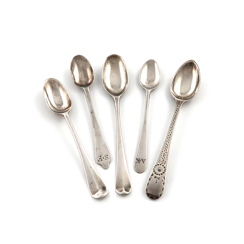 A small collection of five 18th century miniature silver snuff / toy spoons