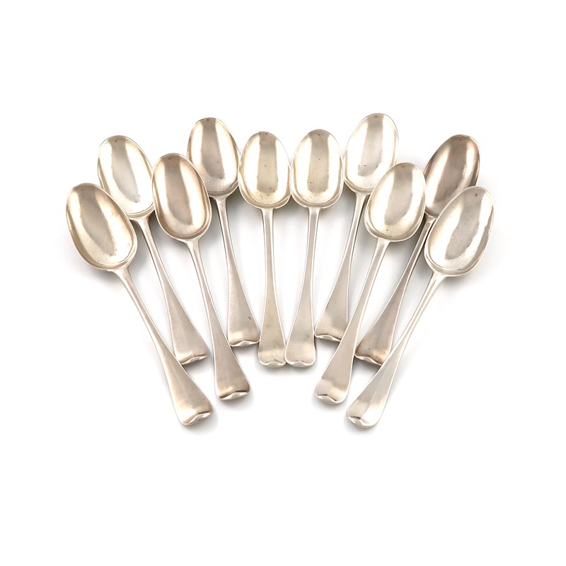 A matched set of ten George I silver Hanoverian pattern dessert spoons