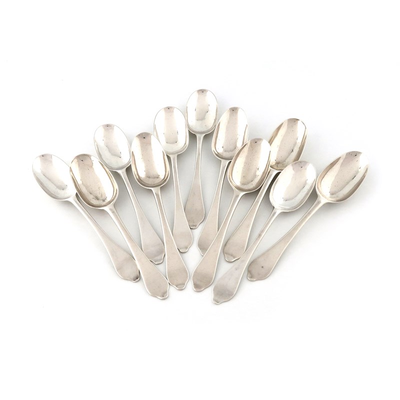 A matched set of eleven early 18th century silver Dog-nose pattern tablespoons,