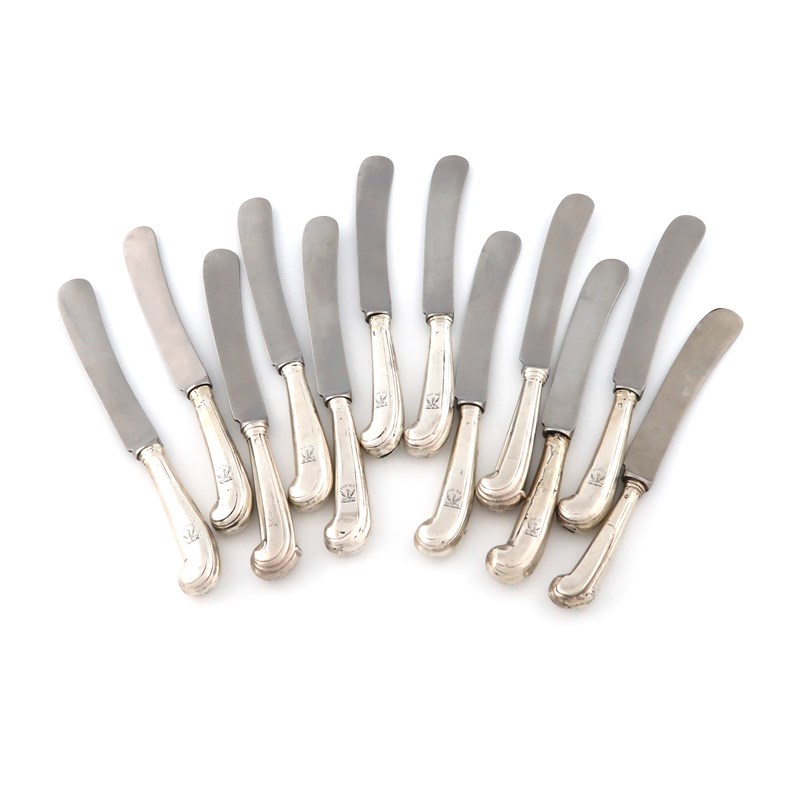 A matched set of twelve 18th century silver-handled Pistol-grip dessert knives