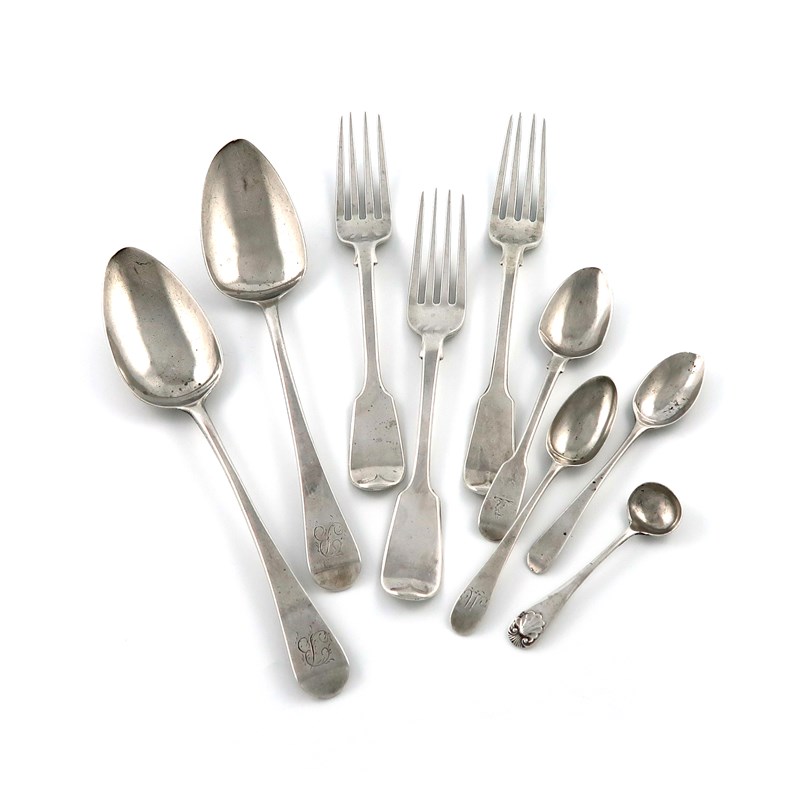 comprising: three Fiddle pattern table forks, by William Chawner, London 1824/26, two Old English pattern tablespoons, three teaspoons, and an Old English Shell pattern salt spoon, approx. weight 12.5oz. (9)