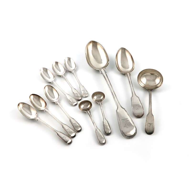 the majority by George Adams, London 1871, comprising: a basting spoon, a set of six teaspoons, a pair of salt spoons, a tablespoon and a single-struck sauce ladle, engraved with a crest, approx. weight 17.5oz. (11)