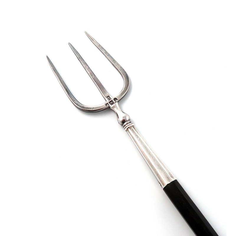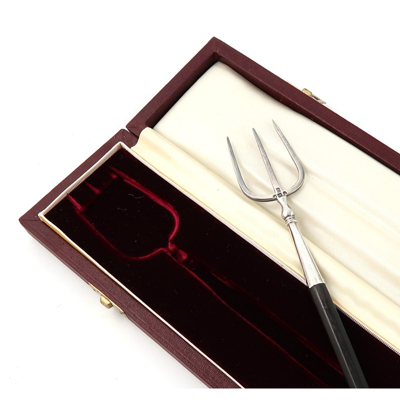 with three tapering prongs, faceted tapering handle, the terminal with a ring attachment, in a later fitted case, retailed by Asprey Plc, length 76.5cm.