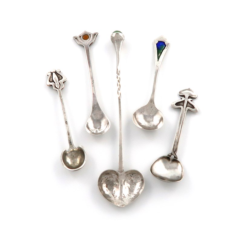 heart-shaped bowl, tapering twisted stem, with a mottled green stone finial, plus a Liberty salt spoon, London 1901, the terminal with an orange circular motif, and a Liberty salt spoon, hoof shaped bowl, stylised terminal, plus a William Hutton and Sons silver and enamel salt spoon, London 1904, the terminal with green/blue enamel decoration, and a salt spoon by James Fenton, Birmingham 1908, approx. total weight 0.9oz. (5)