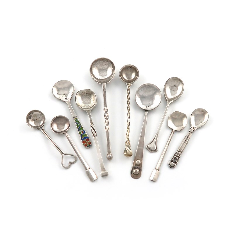 comprising: one by Omar Ramsden, London 1939, one by the Keswick School of Industrial Arts, Chester 1925, one by Bernard Instone, Birmingham 1927, with enamelled decoration, one by the Oxford School of Art, London 1968, one by Georg Jensen, plus six others, approx. weight 2oz. (10)